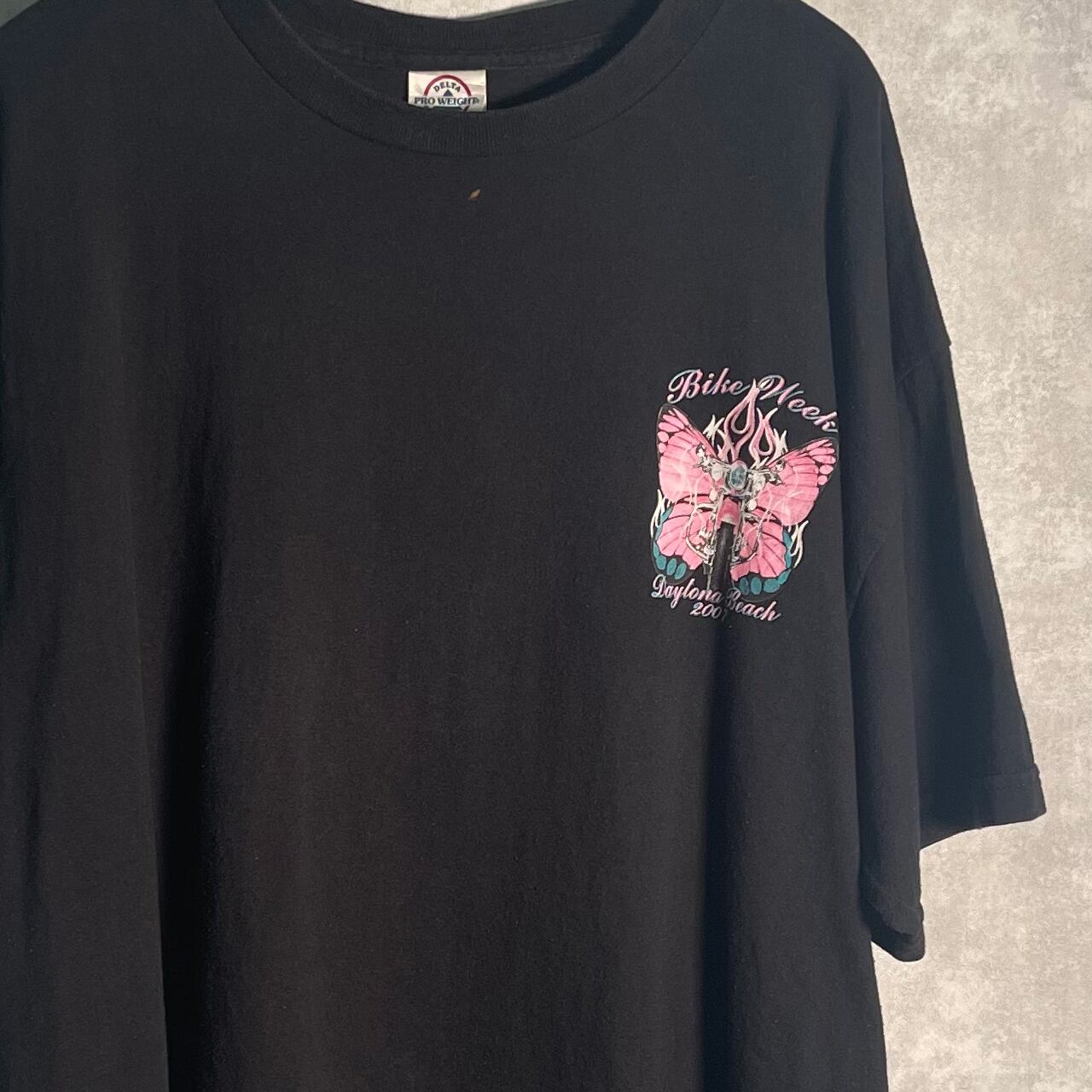 前襟付近に小さな脱色シミ、背面プリントの一部割れがございます。